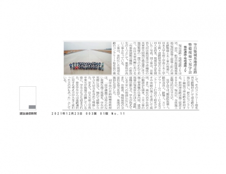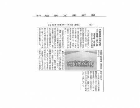 秋葉・加納研ゼミ生を対象とした防衛省・福田道路・地崎道路共催による「航空自衛隊築城基地滑走路整備土木工事見学会」が12月15日、16日の2日間で開催され、その様子が日刊建設工業新聞(令和4年1月7日)および建設通信新聞(令和3年12月23日)に掲載されました。見学会では福田道路・地崎道路JVの若手技術者を中心に舗装版の撤去や路床改良工、路盤工、コンクリート打設等の工程をご説明いただき、さらに防衛省および両社にお勤めの卒業生にもご協力いただき様々な立場における「土木技術者の仕事」に関して懇談を図りました。 コロナ禍での制約のなか、実際の現場、技術者を目の当たりに経験から学ぶ大切さを改めて痛感するとともに、多方面でたくましくご活躍されている本学科卒業生の姿が大変心強く、学生共々大いに励まされました。見学会の詳細は両紙の記事をご参照ください。