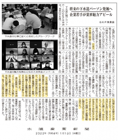 2021年11月25日にZoomにより実施した森田研・佐藤研・高橋研の3研究室合同のゼミナールの取り組みが水道産業新聞社に掲載されました。 ゼミナールでは、下水道広報プラットホーム(通称GKP)未来会のメンバー(※1)が下水道の役割や下水道業界のしくみ、具体的な仕事内容を座談会方式で説明してくれました。その後、無記名で取ったアンケートではほぼ全員が満足と回答しており、自由記入欄には『下水道業界について理解することができた』、『就職活動の参考になった』、『下水道に対する考え方が変わった』などと好印象の意見が聞けました。